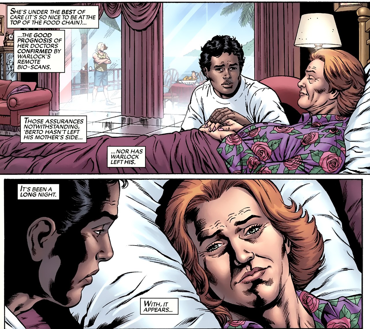 Once the Nazi's are taken care of, they get Sunspot's mother some needed medical treatment. Since Sunspot's family is rich and all, even by non-Brazilian standards, she gets the kind of care only Dick Cheney would enjoy in a lopsided health care system. She gets a clean bill of health, much to Sunspot's relief. While she's recovering, she makes the connections between this event and what happened in the previous issue.