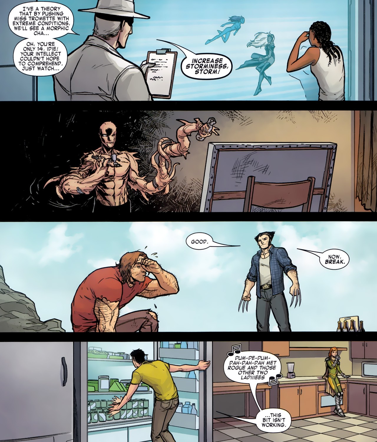 As for Jean Ripoff and her lights, they're basically living their normal lives on Utopia. It's actually a nice insight into how these young teenagers who have about as much X-men experience as the people reading the book actually live. Surprisingly, they're still basically teenagers. They study, they draw, and they sing lousy songs that become extremely embarrassing when someone hears them. Plus one of them is naked in Laurie. I'm pretty sure being naked and not feeling shame is also part of being a teenager, although it reminds me there are certain videos of me on the internet I need to delete.
