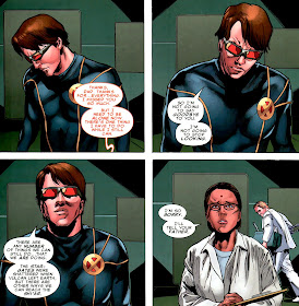 Now that Time Sink is down, Legion successfully reabsorbs him. Rogue also reveals that when she soaked up a bit of his juicy memories, along with the fantasies of her in a thong she discovered that the other personalities were out lying low. They split up because the idea of being locked with Legion again is about as appealing as having root canal done with a jackhammer. So the team's battle isn't over. There's plenty of fight to go around and Frenzy makes a comment at how fucked up this is. By X-men standards it's still pretty tame, but I give her a break because she's knew. If she doesn't have fuck-up fatigue by the end of this arc, then she's not cut out for the X-men after all no matter how powerful Cyclops's penis influenced her.